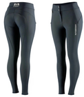 The B Vertigo Women's Thermo Full Seat Silicone Grip Breeches are warm winter breeches that will be your best friend for cold weather riding. These high waist breeches have a nice stretch for comfort in the saddle. Additional features include a hidden zipper pocket on each thigh with space for a phone, along with a special shaped back seat seam for a comfortable fit. B Vertigo's Thermo riding pants are designed with a silicone print full seat for a good grip in the saddle. Furthermore, the warm, insulating fabric will let you enjoy your ride time on those frigid winter days. For added fashion flair, an embroidered logo at the front left thigh and a logo at the back of the waist are included.