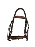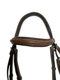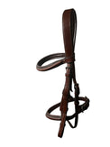 The bridle features mono crown that measures 1 1/4", square raised, fancy stitched noseband and browband, and padded leather. If you want superior construction combined with elegance, look no farther. The leather is soft and supple, and takes well to oiling if you want to darken the leather. Additional features include beveled, rubbed, and finished edges as well stainless hardware with a roller buckle on the caveson, making tightening the noseband easy.